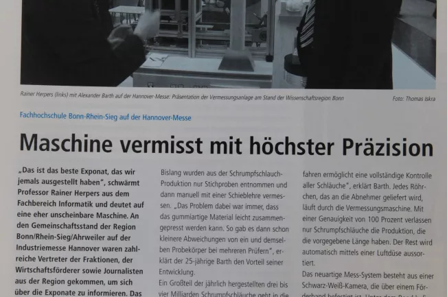In seiner Masterarbeit meisterte Barth 2006 die erste richtig große Herausforderung: Für die DSG Canusa aus Meckenheim, einen hidden champion der Region, der für die Automobilindustrie milliardenfach sogenannte Schrumpfschläuche produziert, entwickelte und implementierte er ein neues Bildanalyseverfahren: Seine Maschine erkennt in der Produktion Abweichungen der Schlauchstücke und sortiert zu kurze oder zu lange Stücke aus. Zuvor wurden die Spezialschläuche von Hand und nur stichprobenartig vermessen.