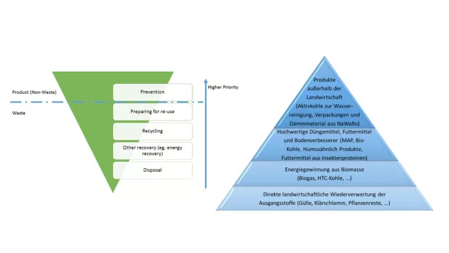 Die nachfolgenden Konzepte und Technologien liefern einen Beitrag, wie bisher schlecht genutzte beziehungsweise ungenutzte Biomasse-Stoffströme in hochwertige Produkte umgewandelt werden können. Die Abbildung verdeutlicht die Strategie der EU (Waste Hierachy) sowie die im Projektkonsortium angestrebten Möglichkeiten einer effektiveren Ausnutzung der anfallenden Biomasse (Wertschöpfungspyramide). Eine Stoffstromanalyse der Biomasse im Programmgebiet wird, in einem ersten Schritt, die Potentiale noch verfügbarer Verwertungsmöglichkeiten unterschiedlicher „Sekundär-Rohstoffe“ aufzeigen.