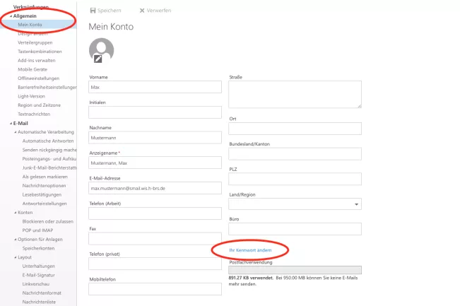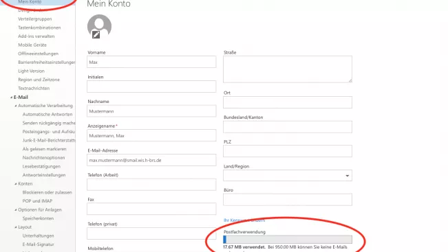 Unter dem Menüpunkt „Allgemein - Mein Konto“, finden Sie Angaben über die aktuelle Auslastung Ihres Postfachspeichers. Ihr Hochschulpostfach hat eine Gesamtgröße von 1 GB, ab einer Verwendung von mehr als 950 MB können Sie keine weiteren E-Mails versenden. Sobald die die Grenze von 1 GB erreicht wird, können Sie keine neuen E-Mails empfangen.