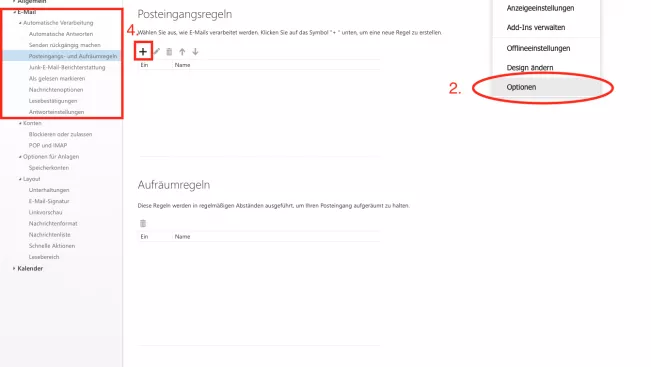 Die eigentliche Weiterleitung richten Sie nun im Bereich „Einstellungen – Optionen – E-Mail – Automatische Verarbeitung – Posteingangs- und Aufräumregeln“ ein. Zum Erstellen einer neuen Regel wählen Sie die Schaltfläche „+“ aus.