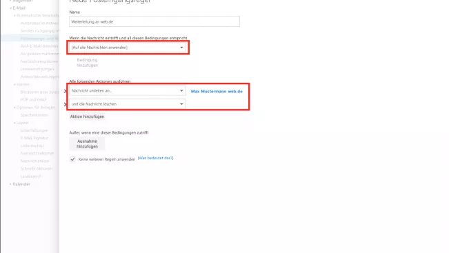 Im folgenden Dialog vergeben Sie einen Namen für die Weiterleitung und wählen aus, dass diese auf alle Nachrichten angewendet werden soll. Im nächsten Schritt wählen Sie unter Aktionen aus, dass Sie die Nachrichten umleiten möchten, woraufhin sich Ihr persönliches Adressbuch öffnet, aus dem Sie die zuvor erstellte Weiterleitungsadresse auswählen.