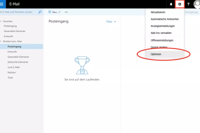 Zur Änderung ihres persönliches Kennworts in OWA wählen Sie nach ihrer Anmeldung „Einstellungen“ (Zahnradsymbol am rechten oberen Bildschirmrand) und hier den Menüpunkt Optionen.