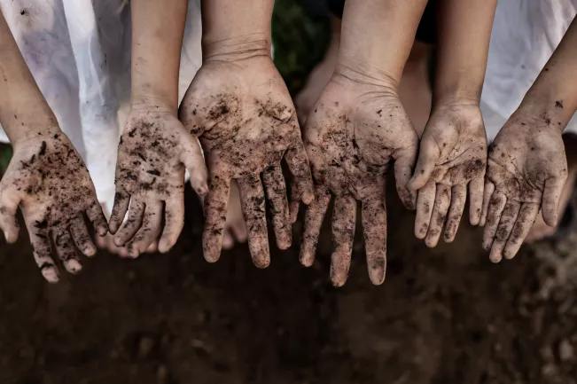 Um die Bodenart zu bestimmen, wird die Fingerprobe gemacht. Dafür wird ein bisschen feuchter Boden zwischen den Händen gerollt und gerieben. So kann man herausfinden, ob die Körnchen eher groß oder klein, klebrig oder krümelig sind. Daraus lässt sich ableiten, wie gut der Boden Wasser und Nährstoffe speichern kann.