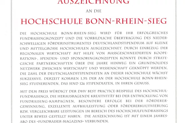 Die Hochschule Bonn-Rhein-Sieg (H-BRS) habe das „Deutschlandstipendium“ in vorbildlicher Weise als Türöffner zum Aufbau und zur Festigung von Fördernetzwerken in der Region genutzt, hieß es am Montag, 8. April 2019, in der Laudatio des Deutschen Hochschulverbandes. Sabine Baumgartner, an der H-BRS seit einigen Jahren verantwortlich dafür, private Geldgeber für das Deutschlandstipendium zu gewinnen, nahm die Urkunde für den Anerkennungspreis entgegen. Zusammen mit Fidegnon Witte, Leiterin des Fundraising, vertrat sie bei der Verleihung des Deutschen Hochschulfundraisingpreises die H-BRS.