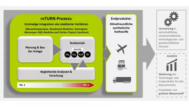 Die Projektpartner von reTURN treten an, um den Verkehrssektor durch eine Sektorenkopplung zu revolutionieren und ein Verfahren zur Herstellung klimafreundlicher, synthetischer Kraftstoffe zu tragfähigen Kosten zu demonstrieren. Mit weitaus höherer Effizienz als in alternativen Verfahren, wie zum Beispiel reinen Power-to-Liquid (PtL)-Verfahren, sollen aus dem Abfallstoff CO2 hochwertige Endprodukte (synthetische Kraftstoffe, grüne Basischemikalien) erzeugt werden. Dazu wird CO2 und CH4 aus einer Biogasanlage verwendet und zu Synthesegas (Kohlenmonoxid und Wasserstoff) umgewandelt. Durch Methanpyrolyse wird das Methan im Biogas in seine Bestandteile zerlegt, sodass grüner gasförmiger Wasserstoff und fester Kohlenstoff entstehen. Diese Rohstoffe bilden die Basis des reTURN-Prozesses, der bis hin zur Herstellung synthetischer Kraftstoffe insgesamt vier bereits etablierte und erprobte Verfahren erstmalig in einem neuartigen ganzheitlichen Technologiekonzept integriert: (1) Plasma-Verfahren mittels Biomethanpyrolyse, (2) Boudouard-Reaktion, (3) heterogene Wassergas-Shift (hetWGS) - Reaktion und (4) Fischer-Tropsch-Synthese. Genau diese Integration und damit die Erprobung einer neuen Technologie stellt die Innovation von reTURN dar.