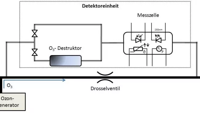 For the intended development of a measuring device as a control element of an ozone generator, a permanently usable ozone monitor that can be switched on quickly is indispensable. In other words, the range of requirements for an online measuring device demands 3-shift continuous operation, as well as instantaneous switch-on behaviour for applications in which ozone is dosed discontinuously by the minute to the second. Up to now, this task has been fulfilled by permanent operation of the UV light source with the disadvantages of high wear of the UV light source (service life max. 10,000 to 12,000 h) and the corresponding energy consumption. This in turn causes heat generation, which is an obstacle to a highly integrated design.