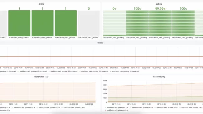 Der Verbund aus der Hochschule Bonn-Rhein-Sieg, den Stadtwerken Bonn und der Stadt Bonn stellen Community Gateways für Bonn und die Region bereit. Hierüber ist es möglich kostenlos IoT-Daten über LoRaWAN an das The Things Network (TTN) zu senden. Bisher sind drei von fünf Gateways im Betrieb und übertragen fleißig Daten. Angebracht wurden sie auf dem Hardtberg, am Heizkraftwerk Nord und am Heizkraftwerk Süd. Zwei zusätzliche Gateways werden in den nächsten Monaten noch hinzukommen, um eine gute Abdeckung der Stadt Bonn zu erreichen.