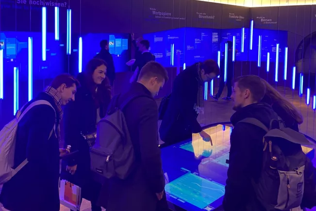 Nach einem Spaziergang durch die Stadt erreichte die Gruppe die Frankfurter Börse, die als zweiter großer Programmpunkt auf der Agenda stand. In einer interaktiven Ausstellung im neuen Besucherzentrum ließen sich der Werdegang der Börse bestaunen und Handelssimulationen auf Touchscreens durchführen. In einem digitalen Quiz traten die Teilnehmenden gegeneinander an, es galt sein Börsenwissen in drei Schwierigkeitsgraden unter Beweis zu stellen.