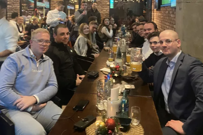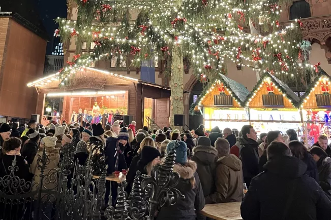 Da der dritte Programmpunkt am Nachmittag, der Besuch einer großen Bank, nicht zustande kam, hatten die Teilnehmenden reichlich Zeit für ein Mittagessen und für einen ausgedehnten Stadtbummel in der Metropole am Main. Am späten Nachmittag traf man sich dann auf dem Weihnachtsmarkt in der Frankfurter Altstadt zum Glühwein-und Punschtrinken.