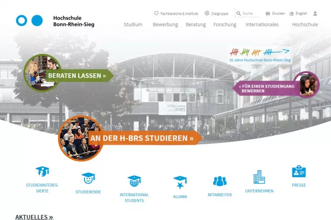 Der Ruf nach einem CMS, das nicht nach dem Baum-Ast-Prinzip funktioniert, also nicht hierarchisch gegliedert ist, sondern eine dynamische Einbindung seiner Inhalte an beliebigen Stellen ermöglicht, wird immer lauter. Außerdem verlangt die zunehmende Nutzung von Smartphones und Tablets ein Design, das sich automatisch an die Darstellung der verschiedenen Endgeräte anpasst. Die Wahl fällt schließlich auf das Open Source CMS Drupal. Der Relaunch mit neuen Bildern und zigtausend Seiten und Dokumenten dauert mehrere Monate, denn nach und nach werden auch die Fachbereichs- und Institutsseiten migriert. Es folgen die Einrichtungen mit Sprachenzentrum und Bibliothek. Hinzu kommt ein interner Bereich mit News, Terminen und Dokumenten ("Intranet").