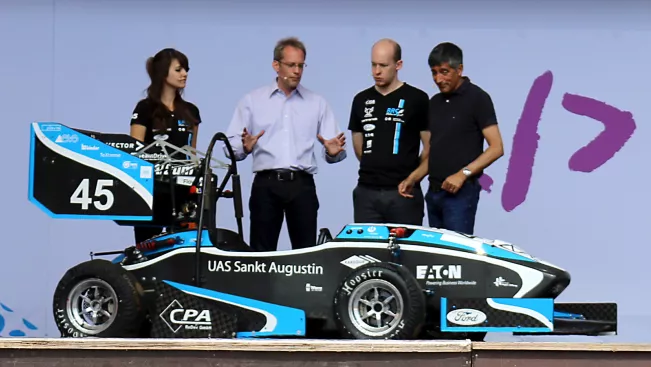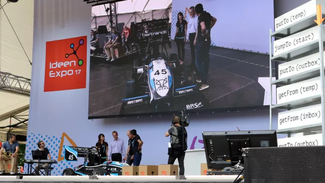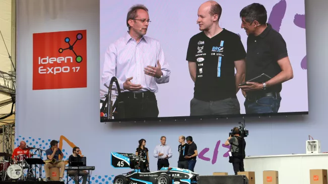 Gemeinsam mit einem Team von BRS-Motorsport sowie dem Rennwagen von 2016 war Professor Dirk Reith auf Einladung der Ideen-Expo nach Hannover bekommen. Er wurde als Referent ausgewählt, weil es mit dem Motorsport-Team an der Hochschule Bonn-Rhein-Sieg besonders gut gelingt, Jugendliche für Technik zu begeistern. Moderator Rangar Yogeshvar vom WDR wollte dann auch wissen, was das Geheimnis ist, das die Studierenden ins Team und an die Hochschule lockt: "Wichtig ist, dass man die Jugendlichen begeistert und sie einen praktischen Sinn hinter den Formeln sehen", führt Dirk Reith dabei aus. "Das gelingt mit dem Motorsport eben besonders gut."
