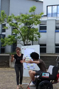 Auf die Frage, was sich die Kooperationspartner von derartigen Studierenden-Projekten erhoffen, antworteten Natalie Chirchietti und Caroline Kuhl von Radeln ohne Alter: "Wir haben nicht die Zeit, solche spannenden Projekte zu testen. Die Studierenden können sich konkret mit einer Fragestellung befassen und kontinuierlich an einem Thema arbeiten." Sehr hilfreich seien dabei auch Feedbackschleifen und der ständige Austausch mit den Werkstätten an unterschiedlichen Standorten gewesen. Und auch Jana Hevendehl von der Stadt Bonn bewertet die Erfahrungen mit den Studierenden positiv und sieht Potenzial für zukünftige Projekte. "Der Kontakt zur Hochschule Bonn-Rhein-Sieg ist uns sehr wichtig. Das Projekt hat neue Erkenntnisse gebracht, die wir nutzen werden. Wir freuen uns auf weitere Zusammenarbeit", so Hevendehl.