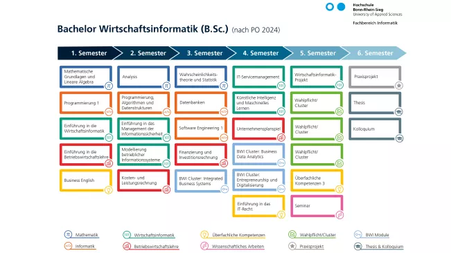 Die Regelstudienzeit des Bachelor-Studiengangs beträgt sechs Semester. In der ersten Hälfte des Studiums werden analytisches, formal-abstraktes und algorithmisches Denken sowie Grundlagen der Informatik, Betriebswirtschaft und Datenverarbeitung vermittelt. Im weiteren Verlauf vertiefen die Studierenden ihr Wissen in Bereichen wie Datenanalyse, IT-Management, Softwareentwicklung oder Digitalisierung von Geschäftsprozessen.