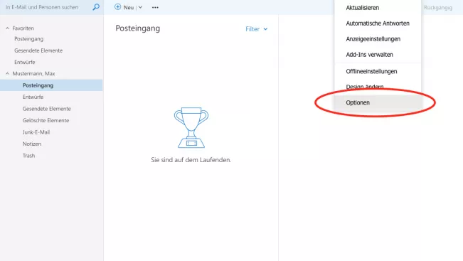 Zur Änderung ihres persönliches Kennworts in OWA wählen Sie nach ihrer Anmeldung „Einstellungen“ (Zahnradsymbol am rechten oberen Bildschirmrand) und hier den Menüpunkt Optionen.