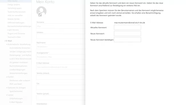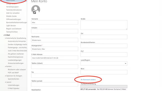 Unter dem Menüpunkt „Allgemein - Mein Konto“, finden Sie Angaben über die aktuelle Auslastung Ihres Postfachspeichers. Ihr Hochschulpostfach hat eine Gesamtgröße von 1 GB, ab einer Verwendung von mehr als 950 MB können Sie keine weiteren E-Mails versenden. Sobald die die Grenze von 1 GB erreicht wird, können Sie keine neuen E-Mails empfangen.