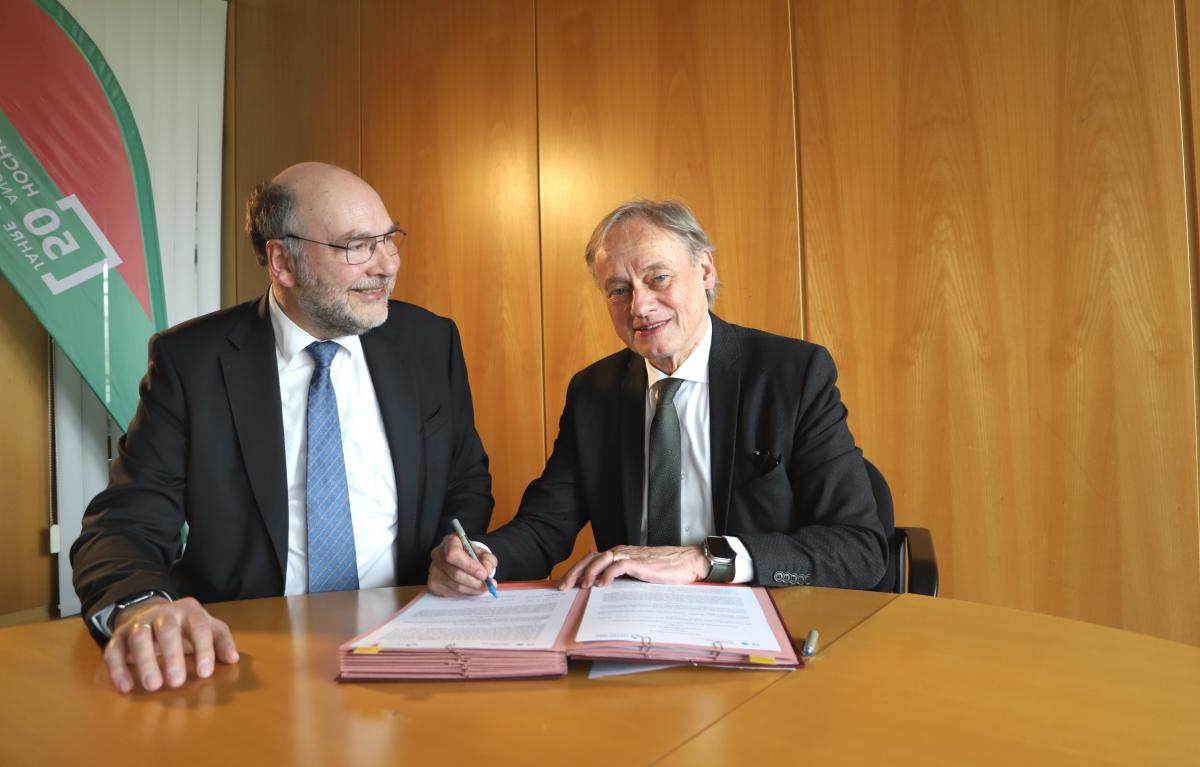 Pressebild 1: Unterschrift unter die Kooperationsvereinbarung: PK NRW-Vorsitzender Martin Sternberg (links) und Hochschulpräsident Hartmut Ihne. Foto: Martin Schulz