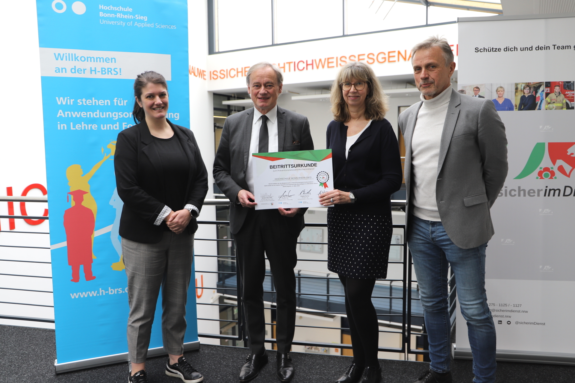 Kanzlerin Angela Fischer und Hochschulpräsident Hartmut Ihne mit der Beitrittsurkunde zum Präventionsnetzwerk „SicherimDienst“. Außerdem im Bild: Anne Herr (li.) und Dr. Peter Petrak von der Netzwerk-Koordinierungsgruppe. Foto: H-BRS
