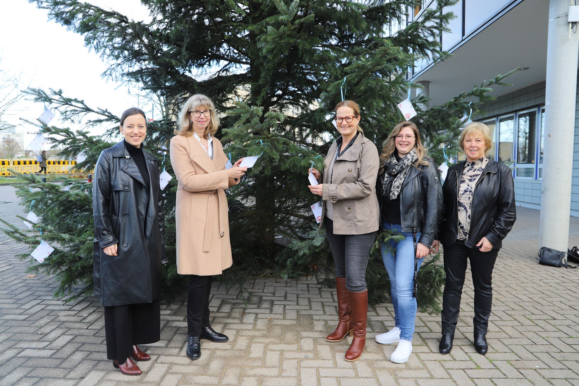 Hochschulpräsidentin Marion Halfmann und die Kanzlerin der H-BRS, Angela Fischer, haben heute gemeinsam mit Vertreterinnen von Obstkäppchen die ersten Wunschkarten an den Weihnachtsbaum gehängt: „Altersarmut und die Vereinsamung von Seniorinnen und Senioren sind gesamtgesellschaftliche Probleme. Mit unserem Wunschbaum möchten wir auf das Thema aufmerksam machen und gleichzeitig unseren Beitrag dazu leisten, den Betroffenen ein schönes Weihnachtsfest zu ermöglichen“, sagte Halfmann. Angela Fischer ergänzte: „Wir als Hochschule führen nun bereits zum vierten Mal die Aktion Wunschbaum in Sankt Augustin durch. Ich möchte sowohl unsere Beschäftigten, als auch Bürgerinnen und Bürger herzlich dazu einladen, ein Teil davon zu werden.“