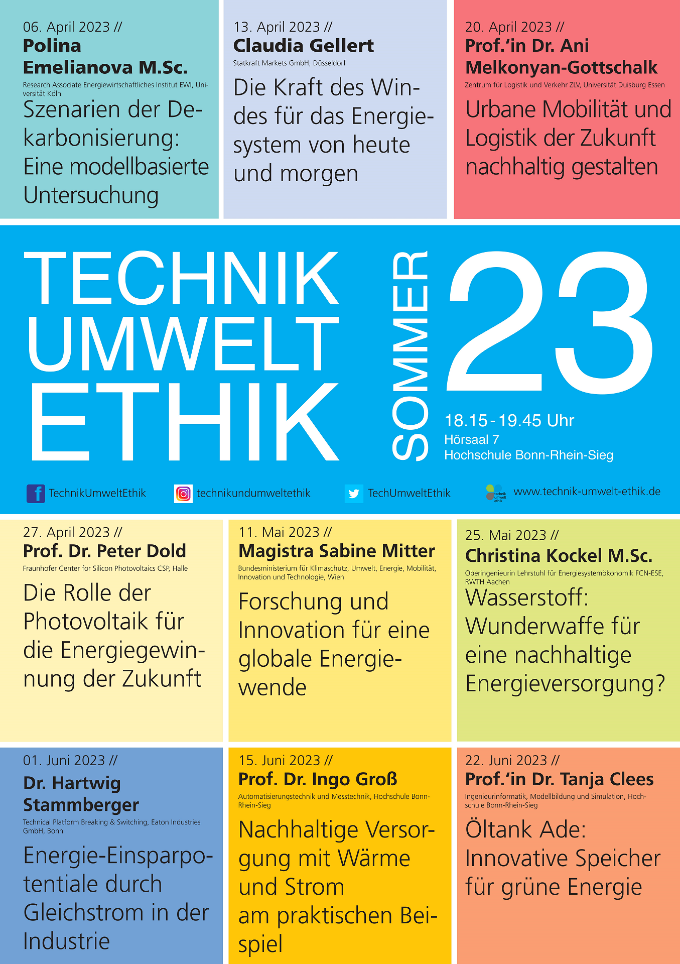 Schirmfrau der Ringvorlesung ist Professorin Tanja Clees, Direktorin des Forschungsinstituts Technik, Ressourcenschonung und Energieeffizienz (TREE) an der H-BRS. Für sie ist die Transformation des Energiesystems eine der großen Herausforderungen unserer Zeit, die nur in weltweiter Kooperation lösbar sei. Die Bereitstellung und Nutzung von Energie habe viele Bezüge zur Technik- und Umweltethik, weil unser Handeln die Umwelt massiv beeinflusse und Gerechtigkeitsfragen aufwerfe. „Diese Ringvorlesung wird Impulse für einen ethischen Diskus geben, der auf wissenschaftlichen Erkenntnissen aufbaut und nachhaltige Lösungen zum Ziel hat“, sagt Tanja Clees.