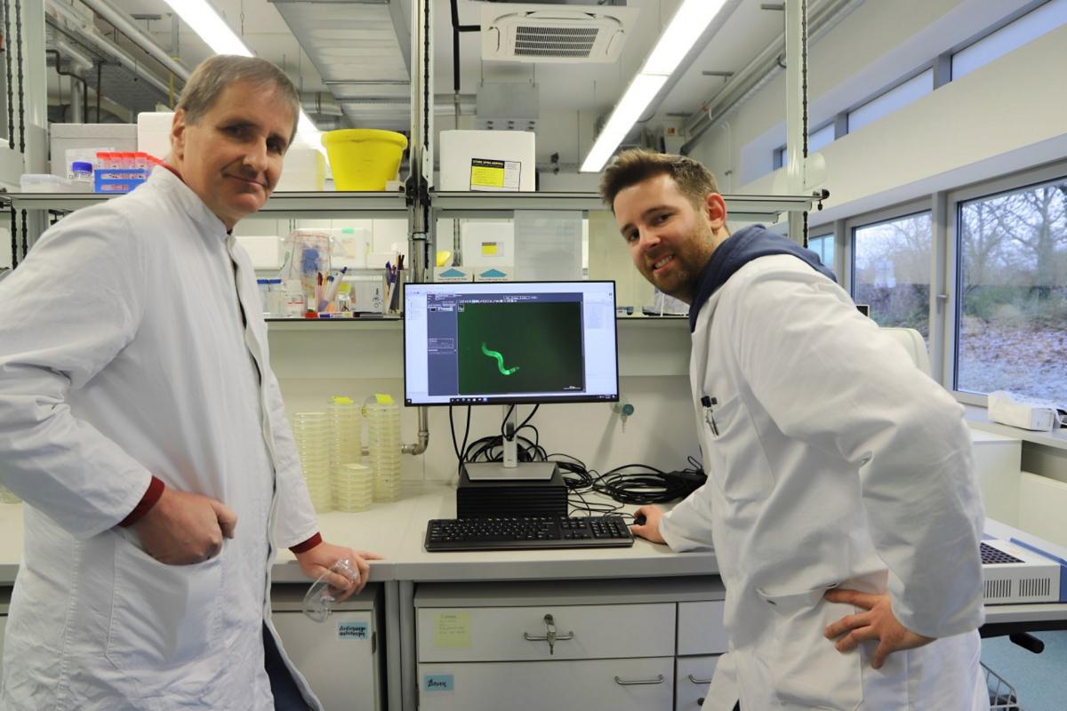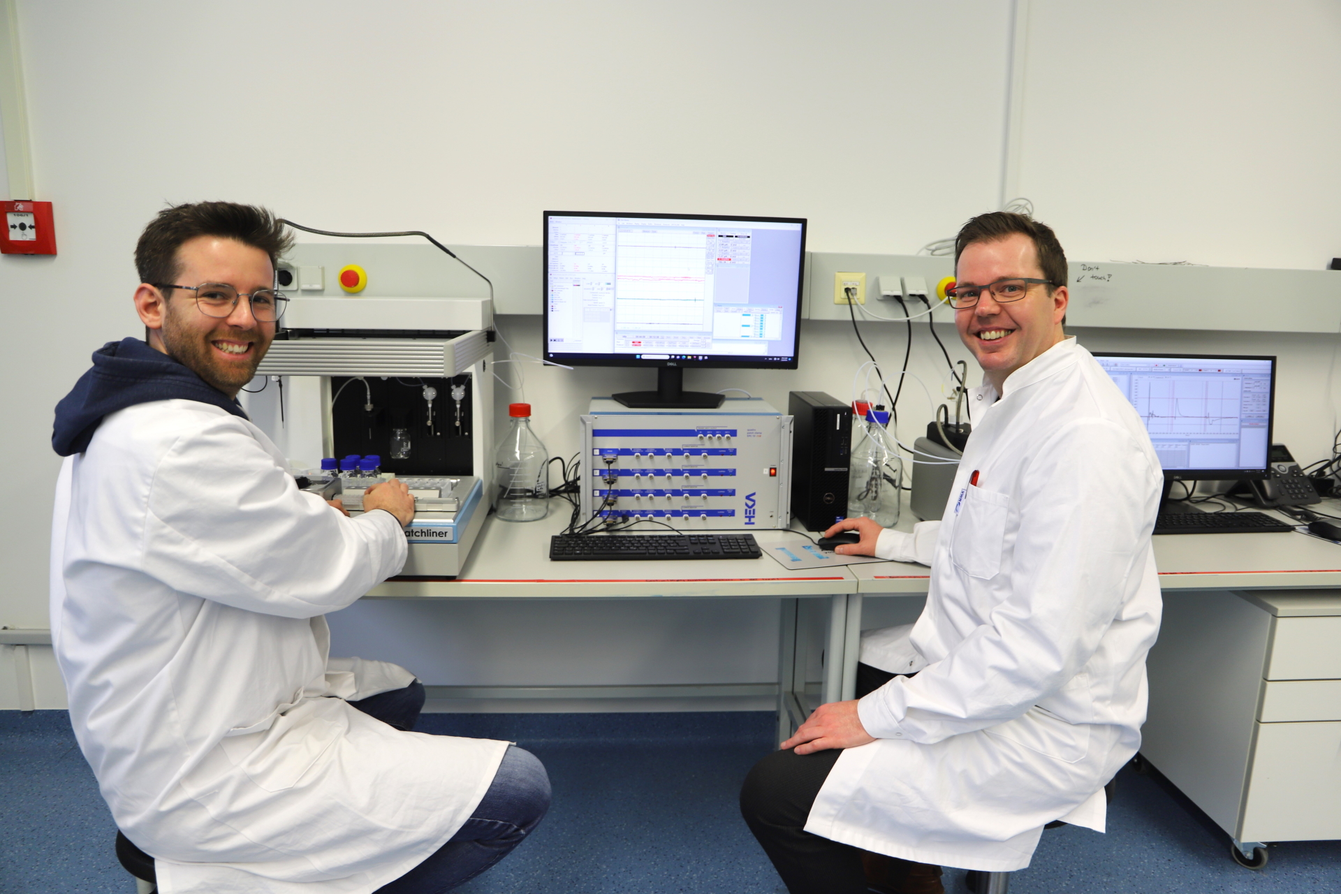 A binding analysis device based on microscale thermophoresis will enable investigations of molecular binding processes, a speciality of Professor Matthias Preller, both of biomolecules with each other and of drug candidates. One advantage of the device is that very small amounts of protein are sufficient for the investigations. Another device enables studies on enzyme kinetics, as well as imaging studies on human cell lines and on nematodes, which serve as an invertebrate animal model. These are topics that are of particular interest to Professor Sass. One advantage here: The use of fluorescence and luminescence measurements means that radioactive labelling can be replaced. The third device, an automated patch-clamp system, is intended in particular to enable comprehensive characterisation of the function of ion channels in mammalian cells.