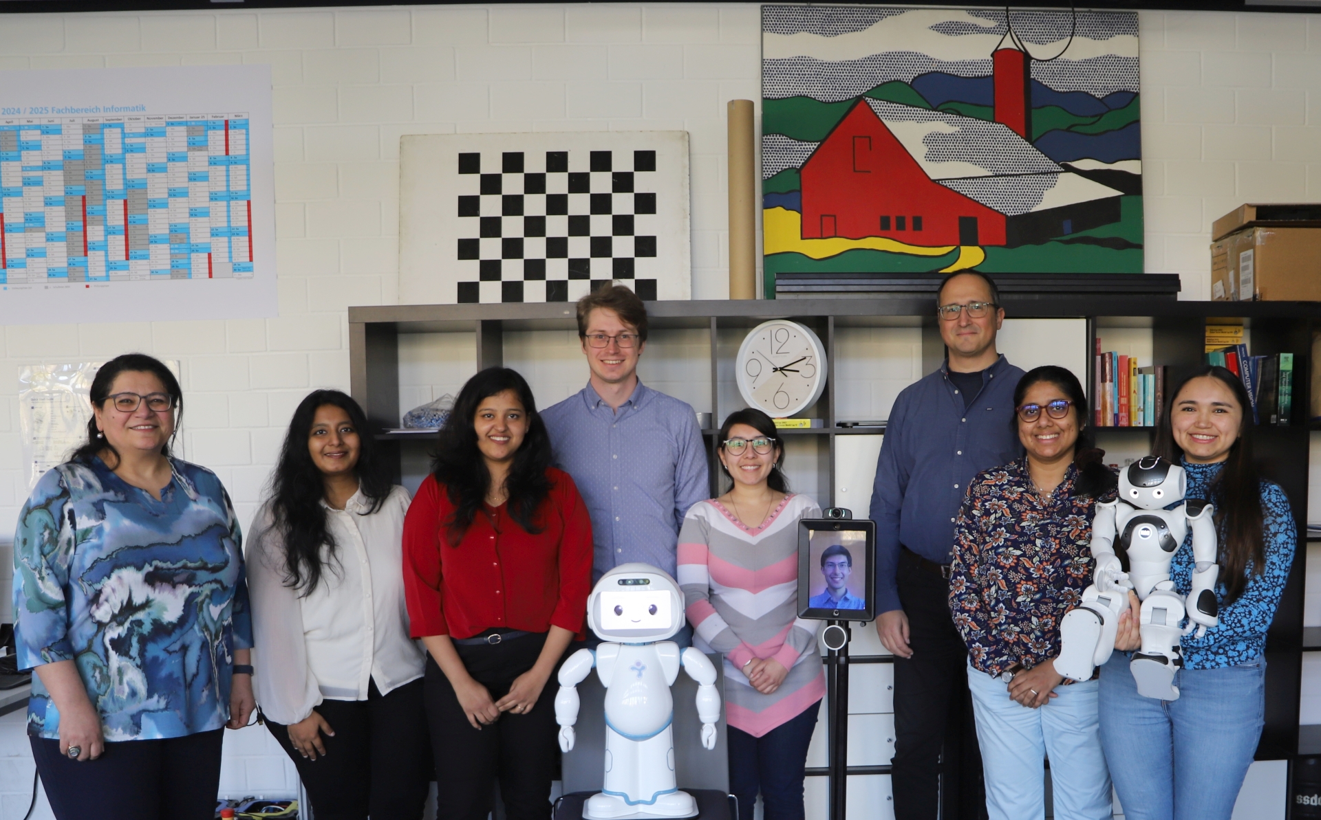 Group photo with team and robots (from left): : Iman Awaad, Swathy Satheesan Cheruvalath, Oviya Rajavel, Michal Stolarz, Paola Rangel Robles, Jordan Schneider (auf Telepresence Roboter), Luigi Lo Iacono, Teena Chakkalayil Hassan und Natalia Quiroga Perez. The robots in the picture from left to right: QTrobot, Double Telepresence Robot, NAO. Photo: Juri Küstenmacher/H-BRS