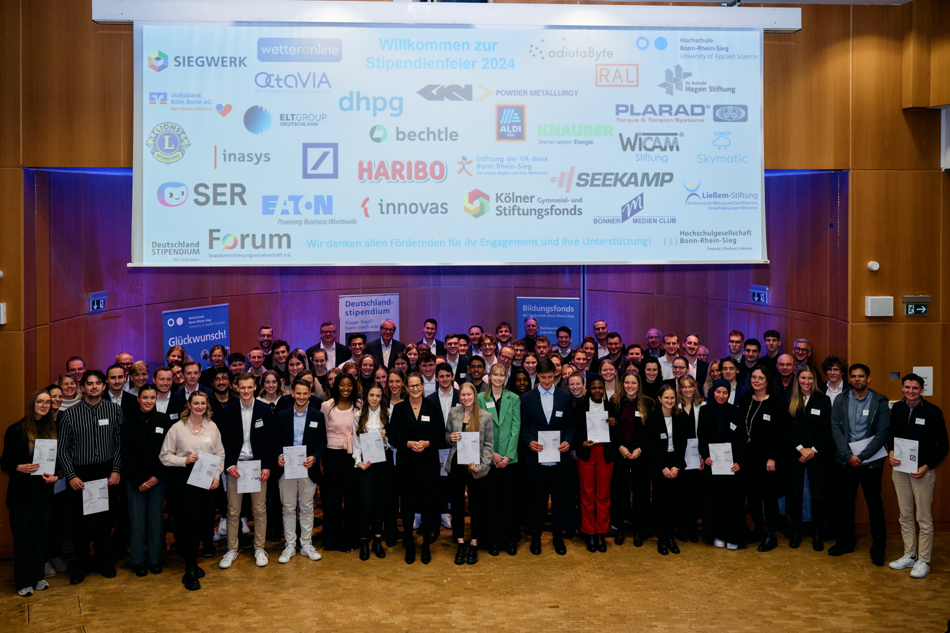 The stage of the largest lecture theatre at Bonn-Rhein-Sieg University of Applied Sciences was almost too small for the obligatory group photo after all the sponsors and scholarship holders of the 2024/25 intake had gathered there. In a festive setting in the Auditorium Maximum in Sankt Augustin, University President Marion Halfmann had previously personally congratulated 94 students from all departments on receiving the Deutschlandstipendium. With the Deutschlandstipendium, students receive a monthly grant of 300 euros for one year. This year, 33 companies and foundations are involved as sponsors in the university's education fund.
