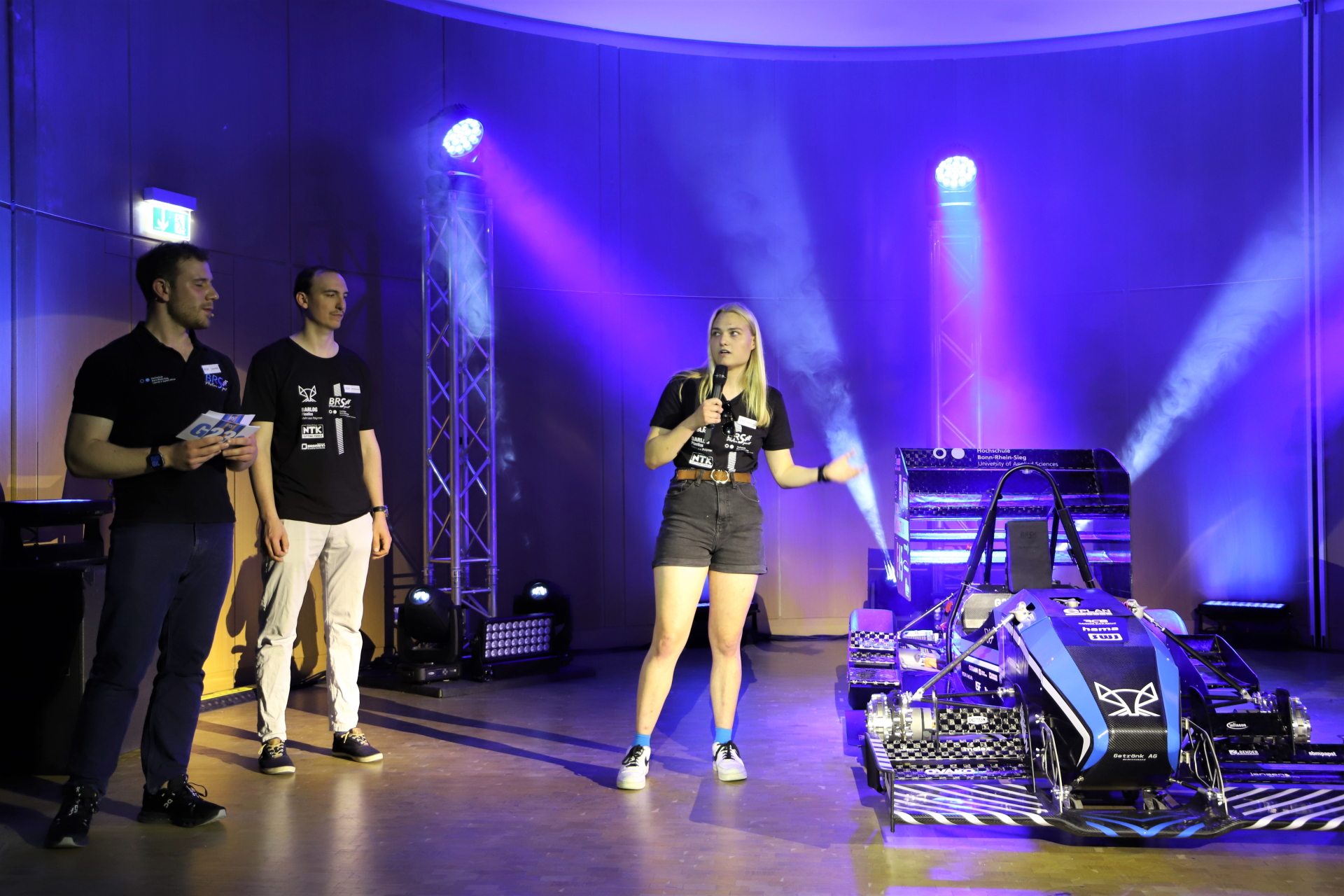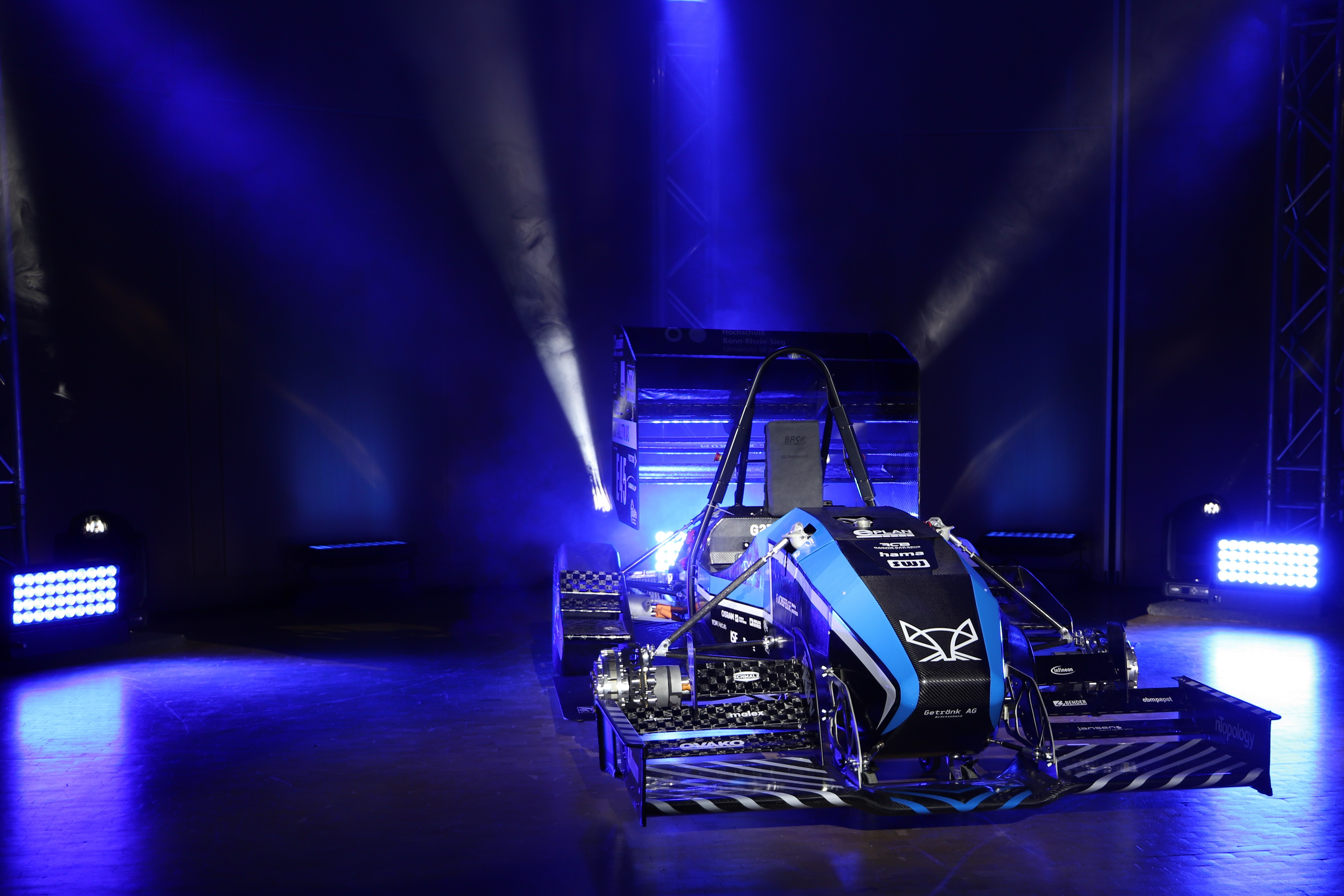 The students of the Bonn-Rhein-Sieg University of Applied Sciences do not have much time to test the new electric racing car and eliminate unexpected weaknesses. Because on 12 July, the new model will already roll onto the starting grid at the Varano race track in the northern Italian province of Parma. The racer for the 2023 season was completed just in time for its first public presentation on Friday, 23 June, in the university's Audimax. Even the night before, the students of the BRS Motorsport Association were still working on the racer in order to be able to present it to the invited audience as long announced.
