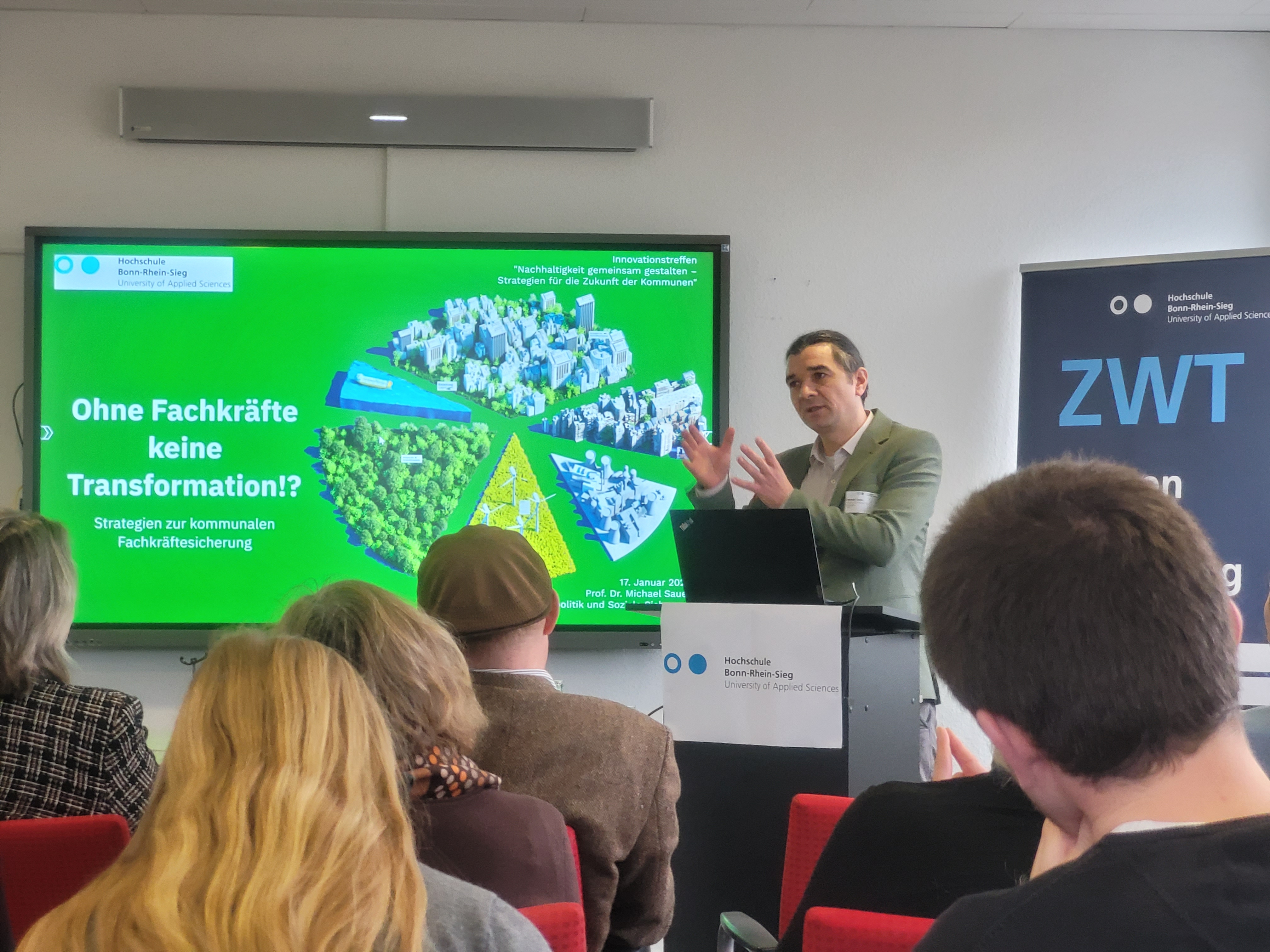 Abschließend widmete sich Professor Michael Sauer, Prodekan und Professor für Sozialpolitik an der H-BRS, der Fachkräftesicherung als Schlüsselfaktor für die Transformation. In seinem Vortrag stellte er Strategien vor, wie Kommunen und Unternehmen dem Fachkräftemangel in der nachhaltigen Entwicklung begegnen können, um die nötigen Kompetenzen für die Transformation zu gewinnen. Langfristig soll ein strategisches Netzwerk mit Praxispartnern und der Hochschule aufgebaut werden. „Es gibt einen immensen Bedarf und zugleich eine große Bereitschaft für konkrete Schritte. Wir müssen unsere Forschungsergebnisse und die vorhandenen Angebote gut kommunizieren. Denn es braucht geschulte Fachkräfte in der Verwaltung, im Handwerk und in der Industrie, die sich mit der strategischen Planung auseinandersetzen. Deswegen entwickeln wir an der Hochschule zielgerichtete Angebote für unsere Studierenden und die Praxispartner.“
